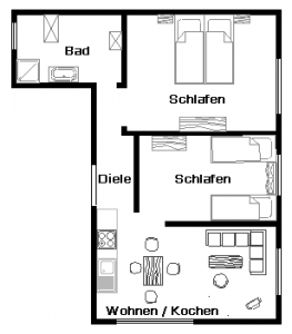 Unsere Wohnung 1 ist 45qm groß und bietet Platz für 4 Personen. Zur Ausstattung 9gehören nebem TV und Radio auch eine Einbauküche mit Kaffeemaschine, Toaster und Spülmaschiene.